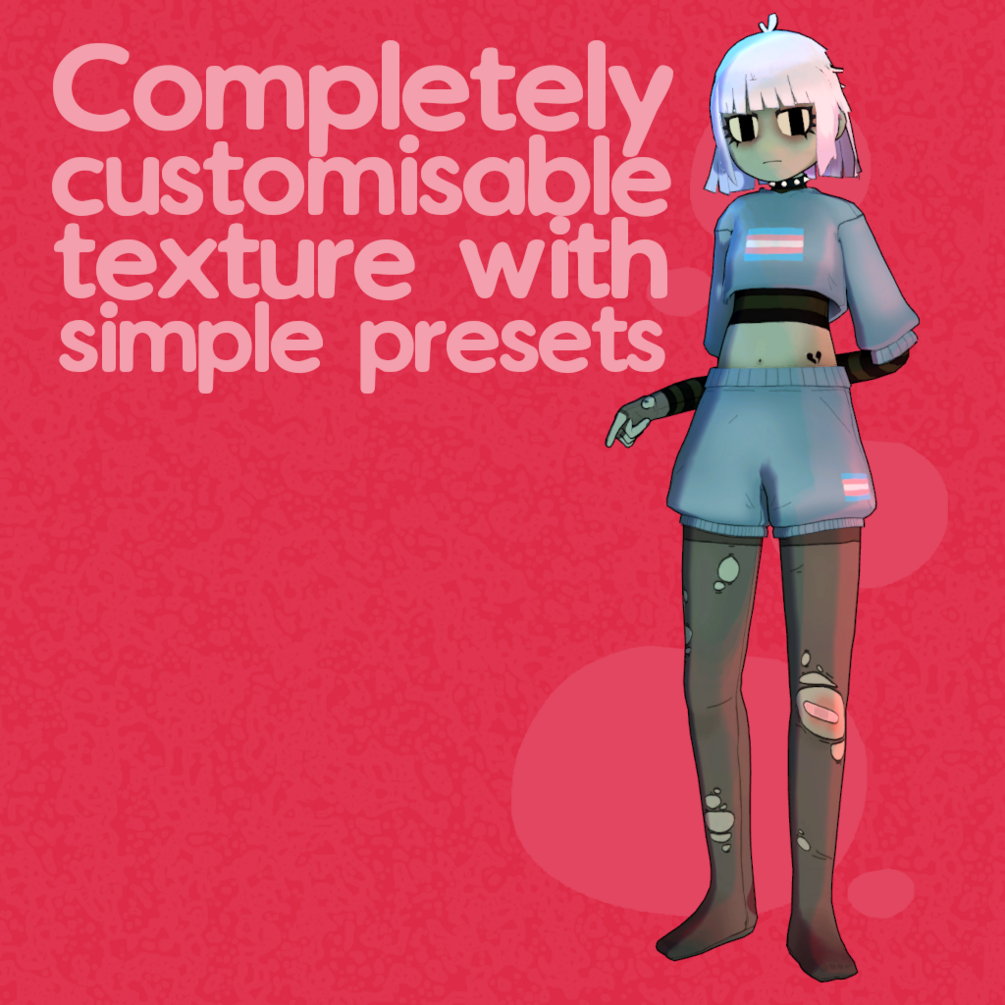 Included: Preconfigured materials & files to customise and animations, the .FBX files, and a unitypackage with everything set up correctly to be used across both PC and Quest. More info in the READ_ME